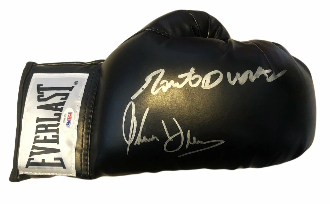 Everlast Black boxing glove. Hand-signed in black felt-tip pen by Tommy Hearns and Roberto Duran Dual signed.