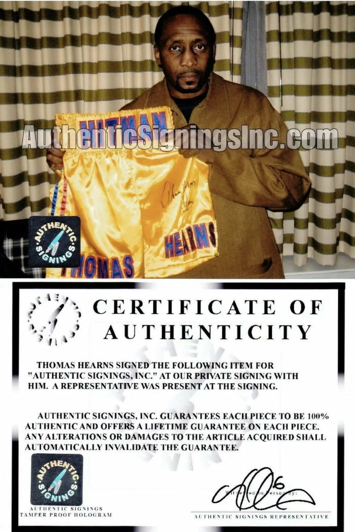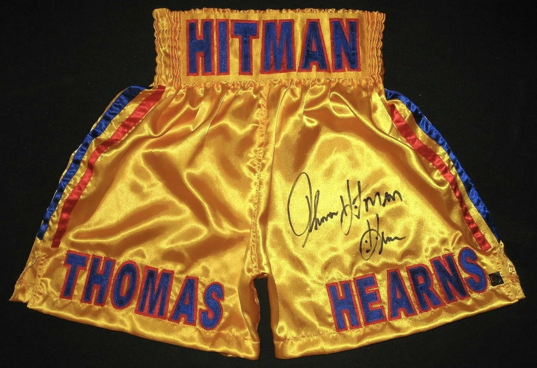 Custom boxing trunks have been hand-signed in black felt-tip pen by Tommy “Hitman” Hearns.