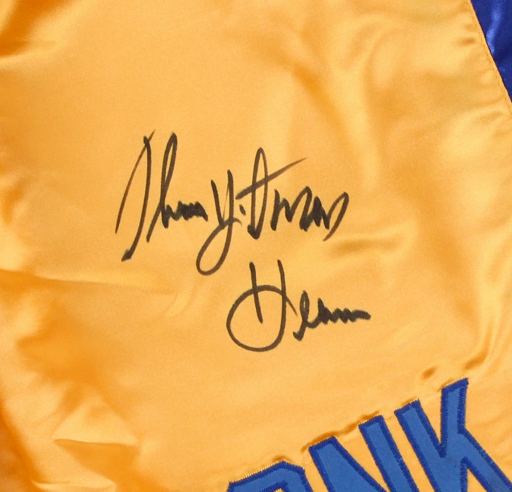 Custom boxing trunks have been hand-signed in black felt-tip pen by Tommy “Hitman” Hearns.