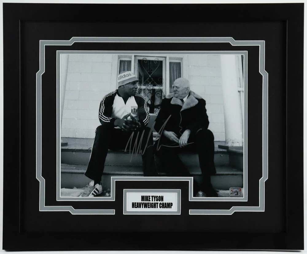 Custom frame measures 22″ x 28″ in size and features a photo hand-signed by Mike Tyson (HOF).