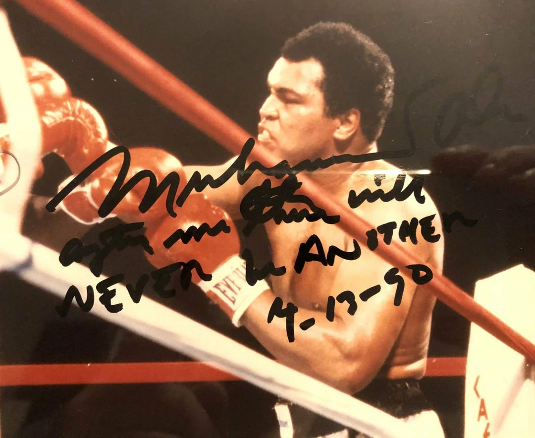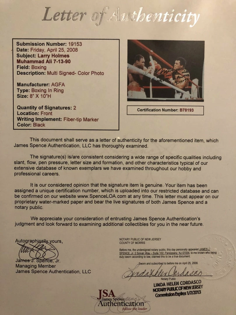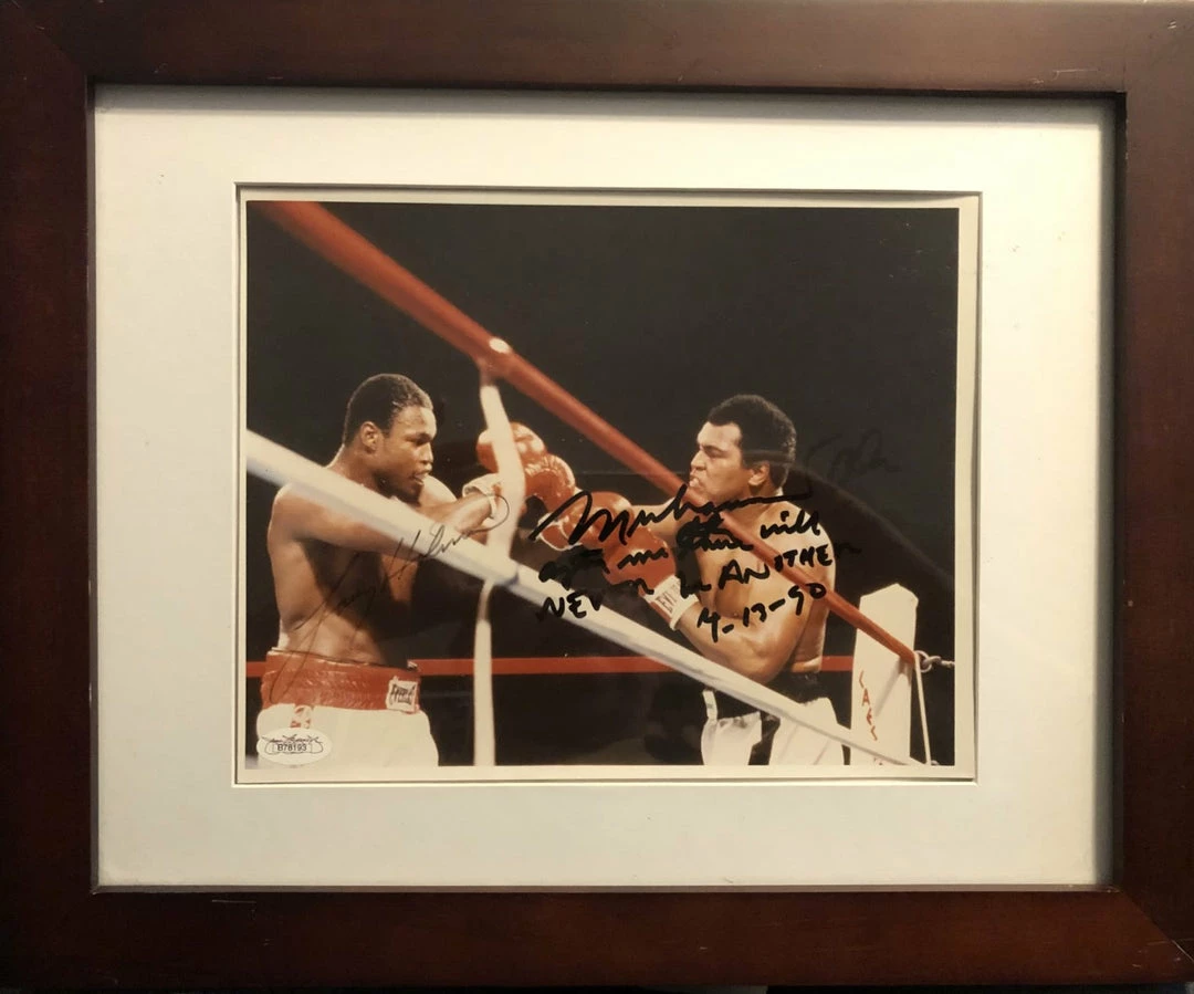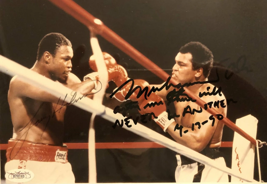 Ultra Rare and a collectors Dream! Muhammad Ali vs Larry Holmes Dual signed JSA 8×10 Boxing Photo Rare Autographedย signed by Muhammad Ali. A true Vintage Piece of Boxing History!