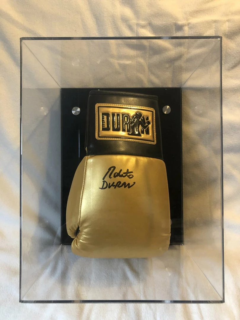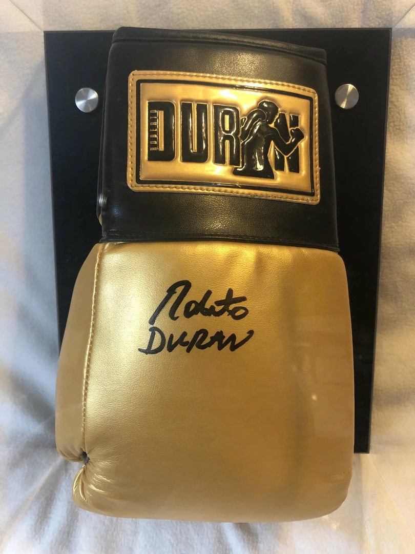 Roberto Duran autographed signed limited to 50 custom title made boxing gloves. This limited edition to only 50 made title gloves comes in our ultra new design display case. ready to lay on any surface or hang on any wall. iconsofboxing.com suggested limited Edition investment pieces!