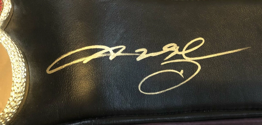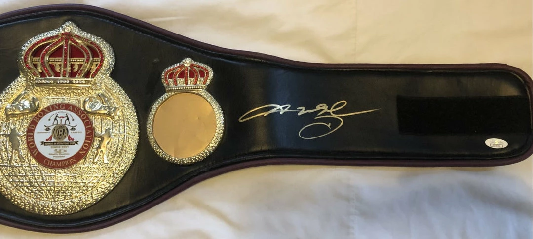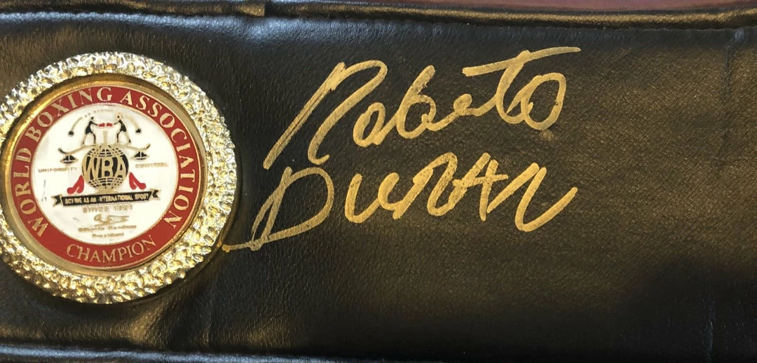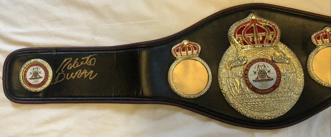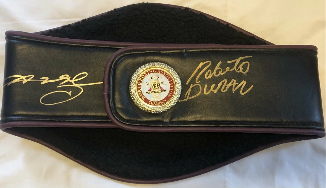 Roberto Duran & Sugar Ray Leonard Autographed WBA Championship Full Size Belt, In Person Hand signed at the Ring10 fundraiser 2018 Photo Certified – A simply stunning piece. Personally signed by Duran. Also backed by iconsofboxing.com Guarantee. And Sugar Ray Leonard was later added to several belts.