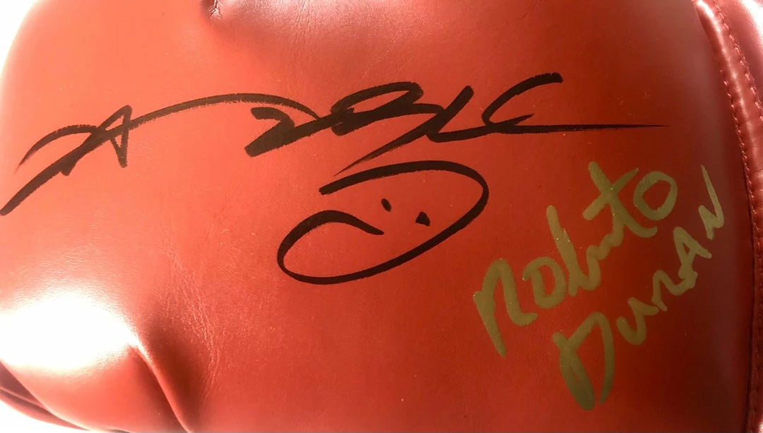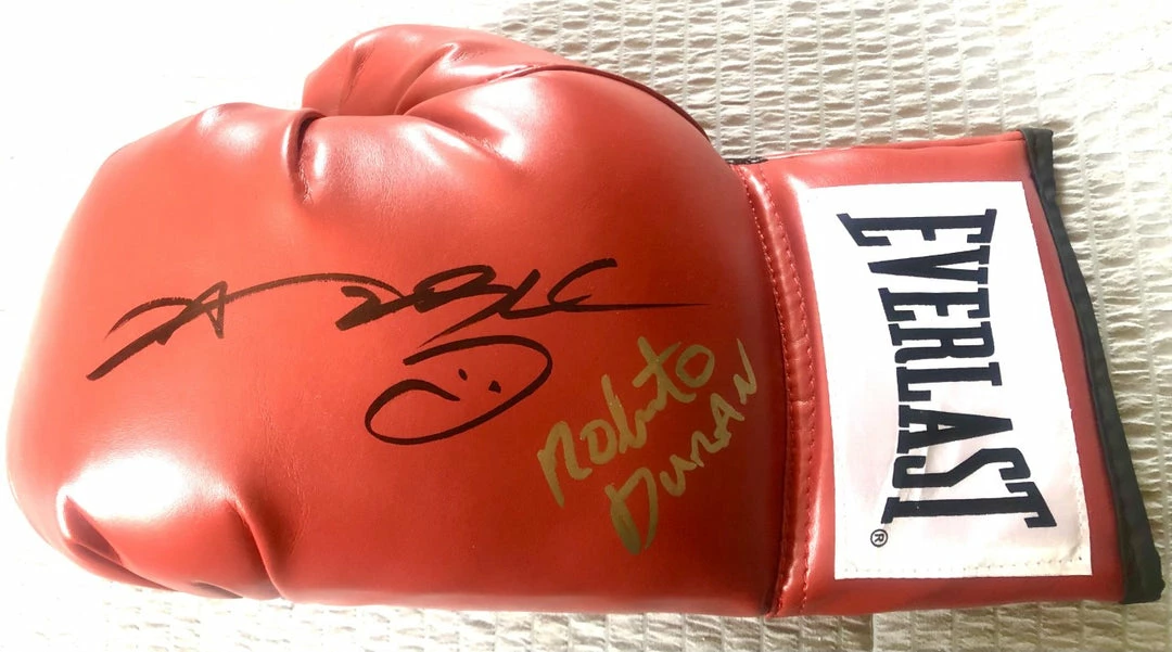 This glove has been personally hand-signed by Sugar Ray Leonard and Roberto Duran on a red Everlast Boxing Glove. Autographs Comes fully certified and tamper-evident hologram. Certified. Also backed by iconsofboxing.com Authenticity Guarantee.